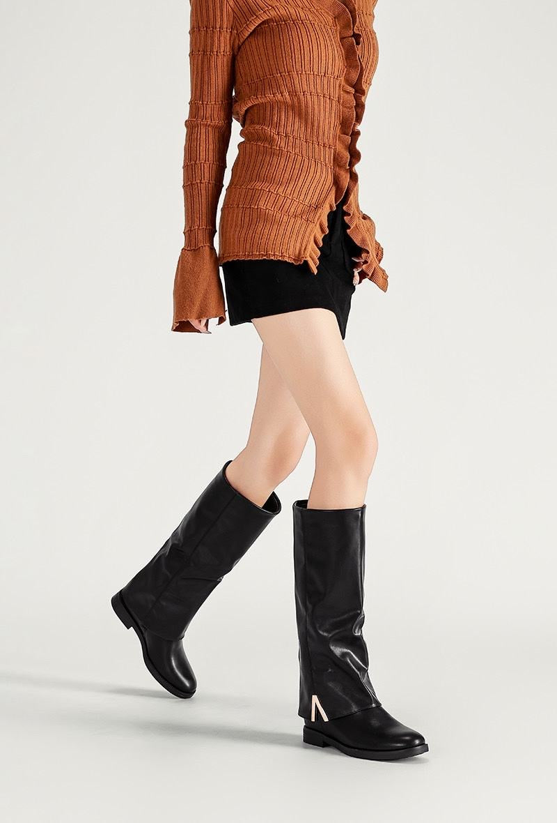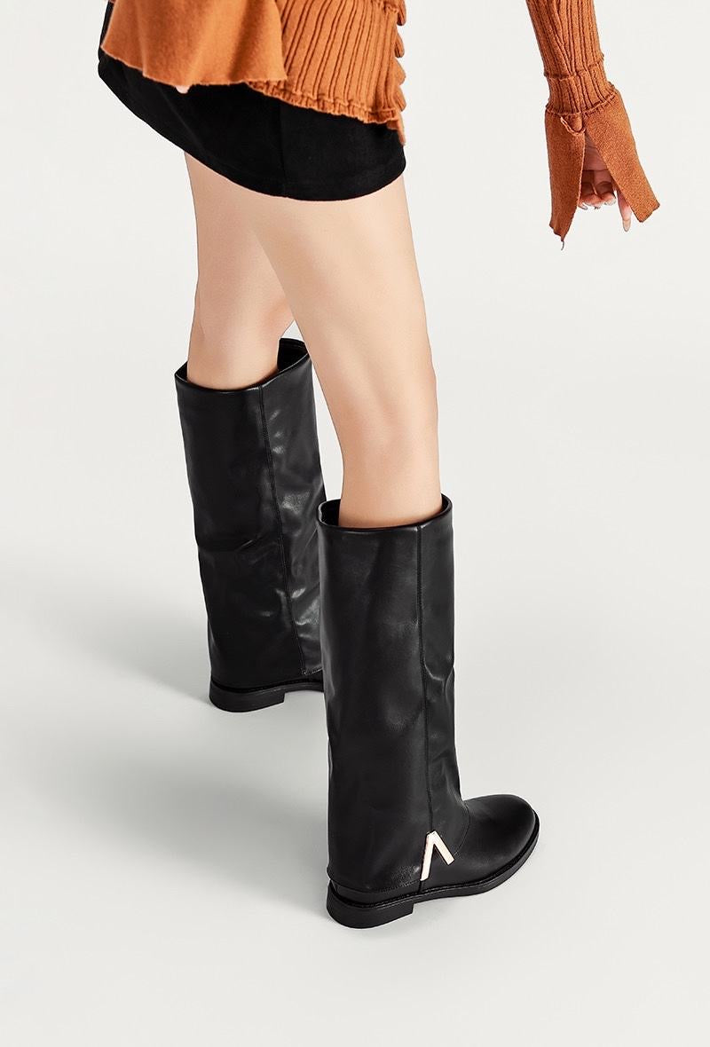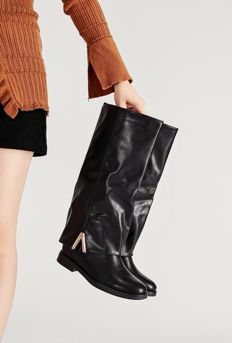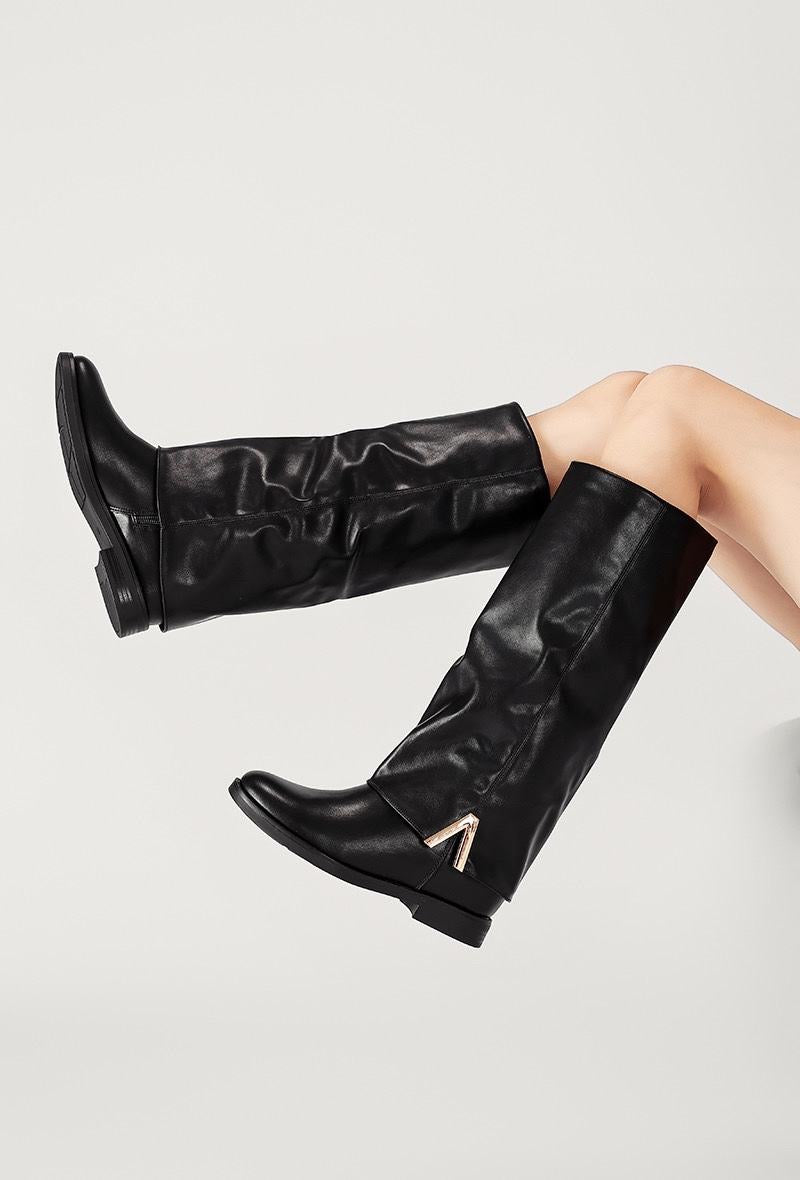 Gli Stivali Cover V Neri perfetti per comfort e look elegante tranquillo. Suola piatta per camminata comoda, materiale morbido, dettaglio V oro sottile.